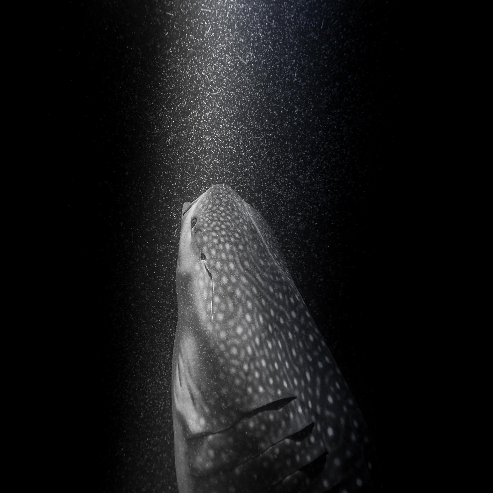 During a night dive to film whale sharks, we placed a single LED panel on the surface, drawing a column of plankton that shimmered down to the seabed. After hours of waiting, we had the extraordinary surprise of a whale shark appearing, positioning itself within this living vortex, bathed only in the soft, mysterious light.