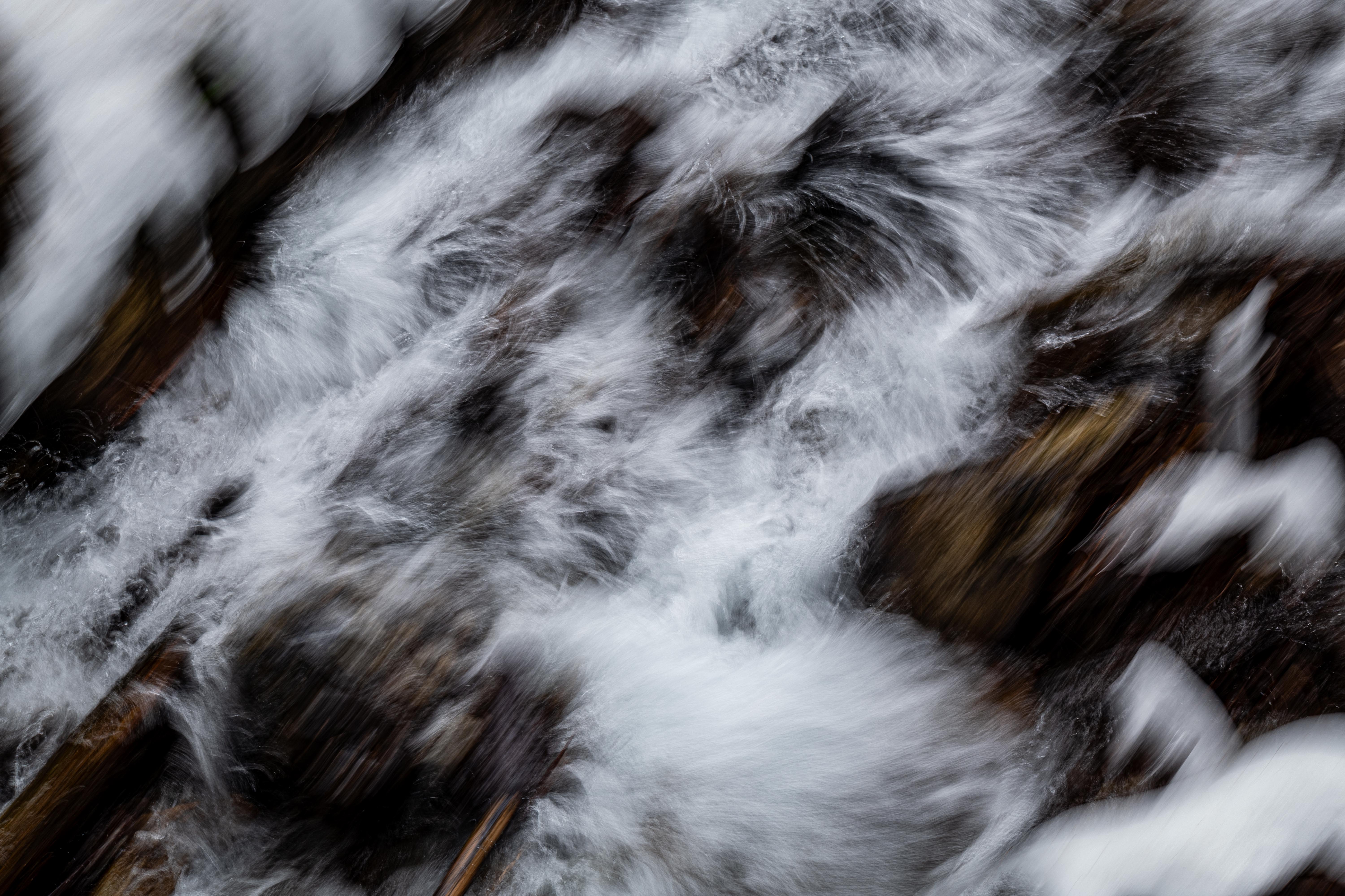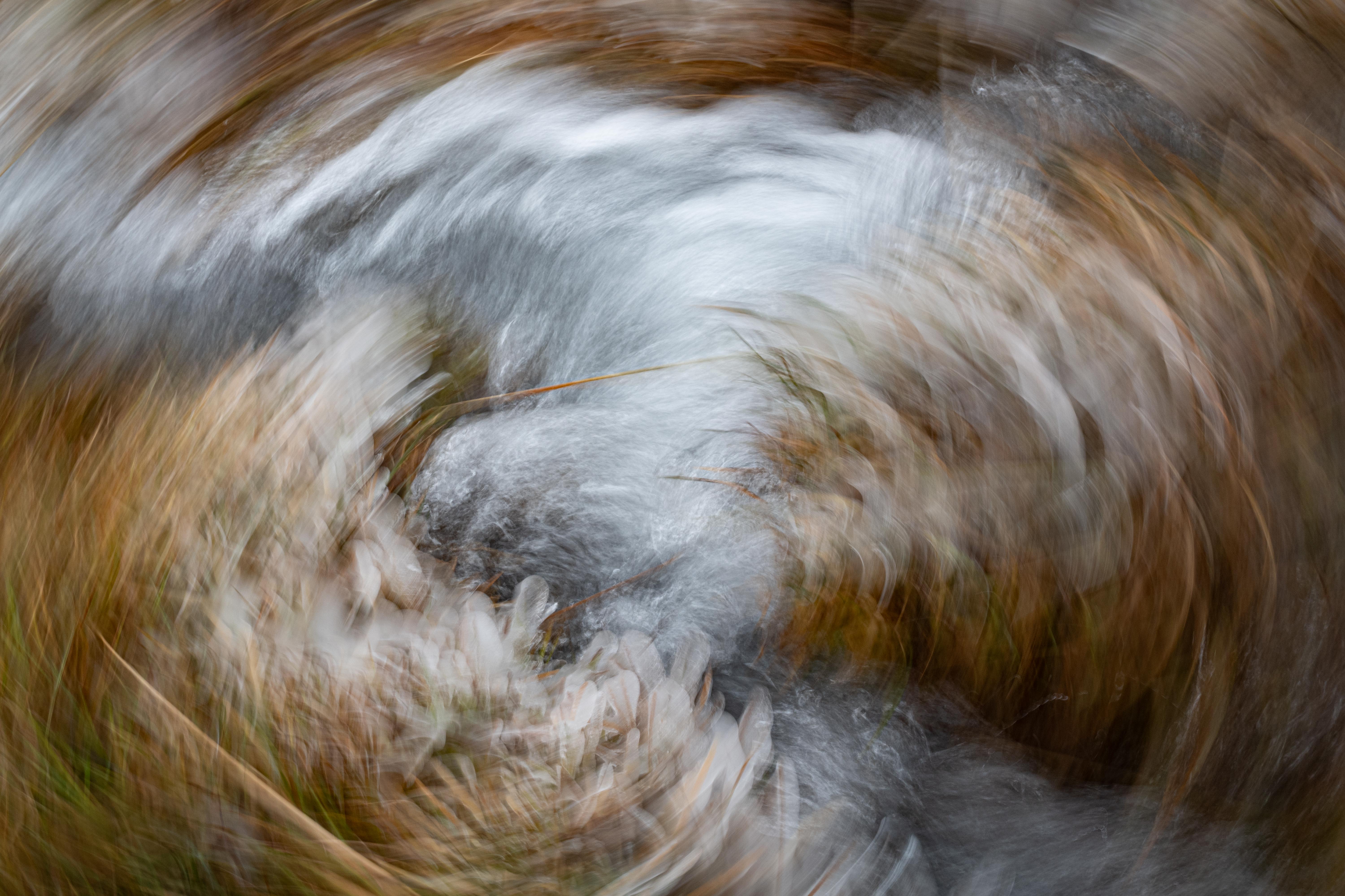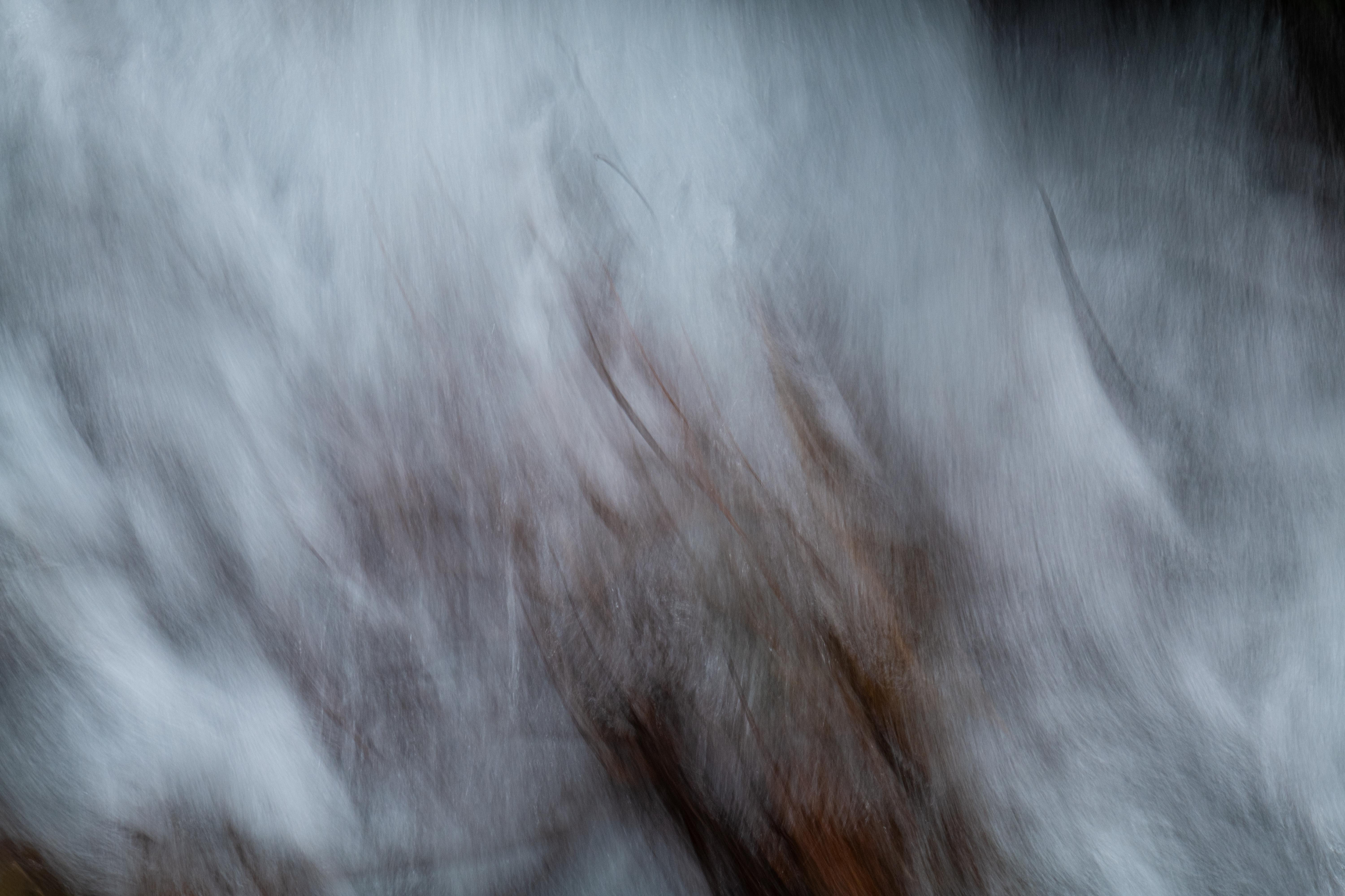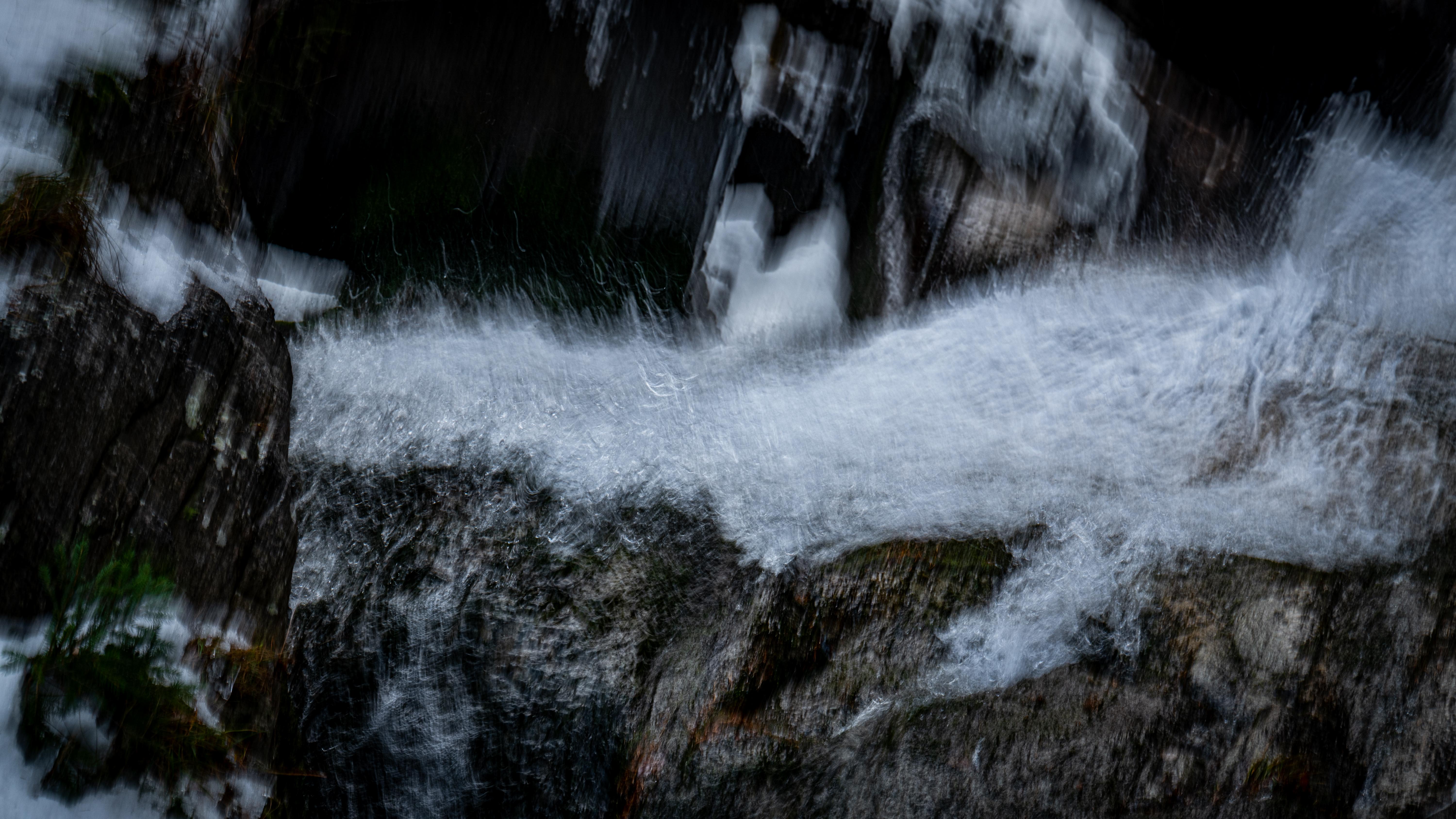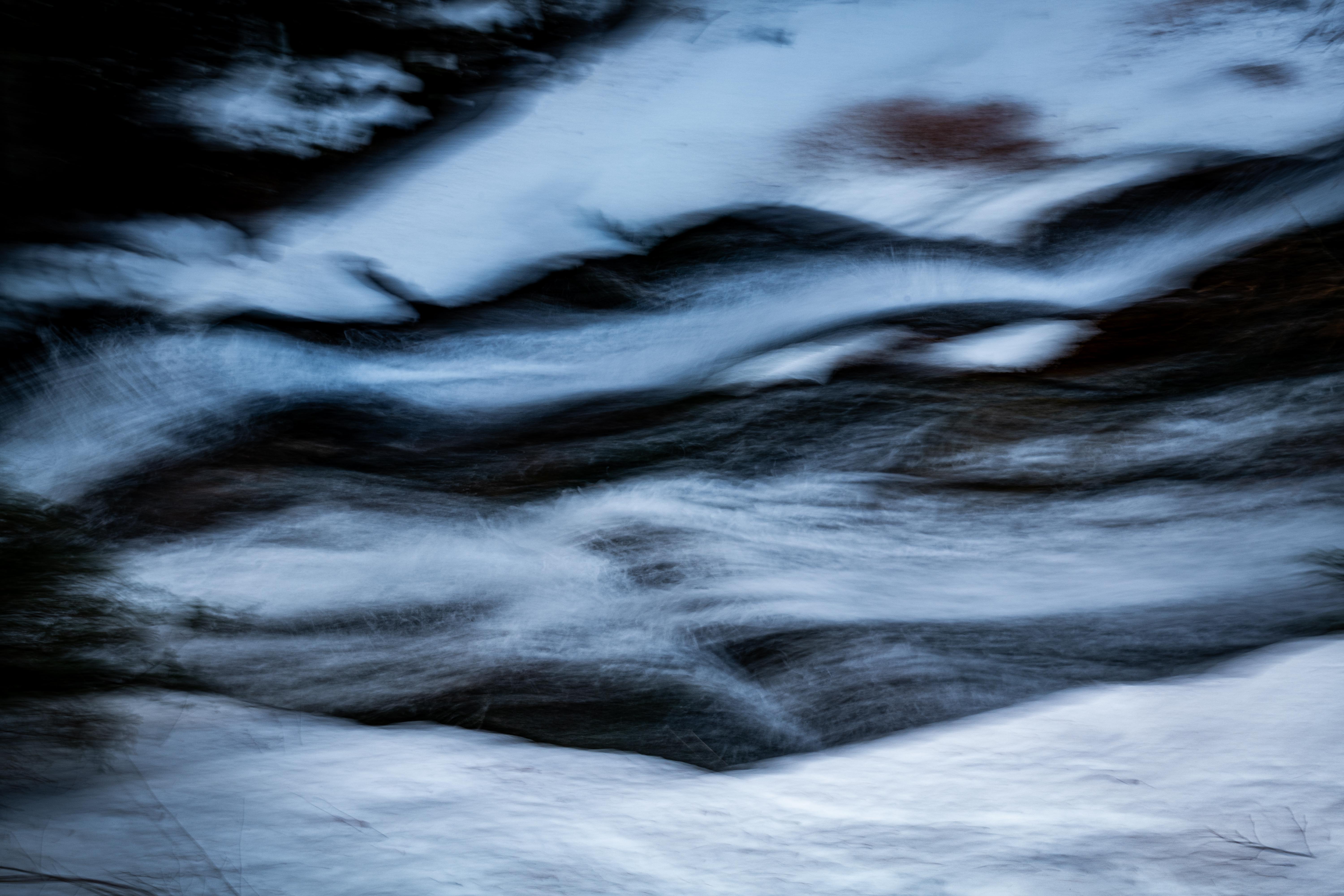 I walked along a cross-country ski track beside a narrow stream of clear water, watching a few fish dart away. After a while, I heard a stronger current — the slope changed, and through a tangle of wood and ice, the water tumbled down the hillside, alive and fierce. I stayed for over an hour, following it upstream with childlike excitement. It was magnificent chaos. I filmed in slow motion, captured dozens of images, then a few clips in real time to remember its soundscape.